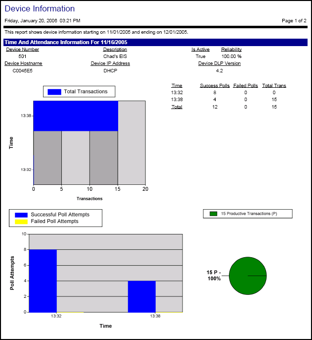 This report displays information on the selected devices used in the system. The fields show the device number, description, whether the device is active, the percentage of reliability, the device host name, the device IP address, and the device DLP version.