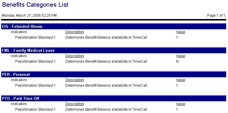 This report lists the benefit categories set up on the Benefit Categories screen and the indicator setting for each category.