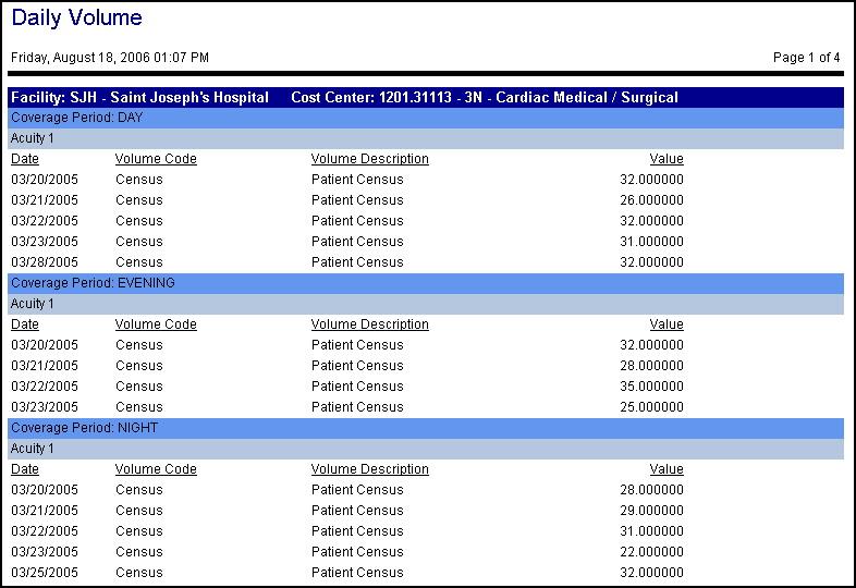 This report lists the productivity volume codes and daily values for the selected organization units during the indicated date range.
