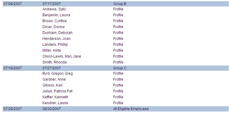 The report displays the following information: The schedule periods within the organization units that are open for self scheduling during the entered date range, the open date and the end date of access, and the name of the self scheduling group that has access during that date range. If the Include Employees option is set to Yes, the employees who are a part of the group are listed, as well as the source of their assignment to the group (either based on the Profile attached to their position or as a direct assignment via the Labor Distribution screen in the employee record).