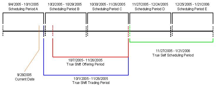 In above scenario, when the Current Date is 9/18/05, the Shift Trading Access Period will be from 9/21/05 until 11/16/05. The Shift Offering Access Period will occur from 9/27/05 through 11/4/05. The Self Scheduling Access Period will be from 11/17/05 until 12/17/05. However, the below diagram displays when these actions are valid due to Schedule Period occurrences.