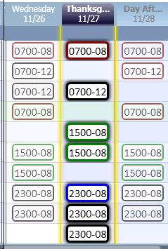 Clicking on the date header will highlight all the schedule cells for that date. The user can then delete or copy all the schedules for that date. this feature can be used to clear all the schedules for a holiday, so the scheduler can update the staffing for that day.