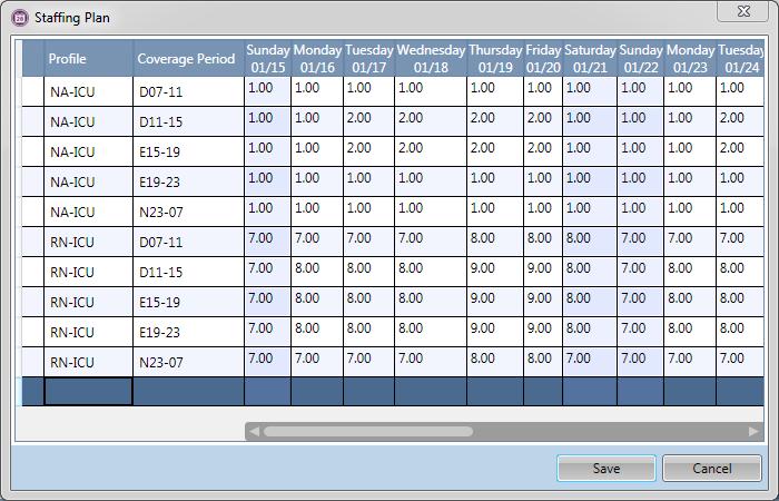 The Open Staffing Plan function opens a screen to view and/or edit the staffing levels needed for each day of the scheduling period. These staffing need values are set up by profile and coverage period.