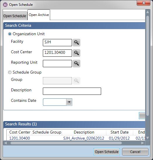 A schedule that was previously archived can be opened and viewed by using the Open Archive tab to search for the record.